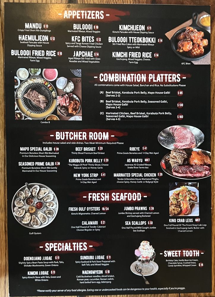 Pork belly(mild or spicy) map galbi, galbi, brisket, seasoned chicken. Comes with salad and banchan. Served raw to cook at home or cooked to your desired temperature.